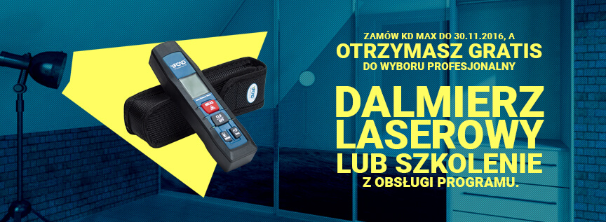 zachęcamy do skorzystania z naszej najnowszej promocji. Wszystkie osoby, które zamówią licencję programu KD Max do 30 listopada 2016 r. otrzymają gratis profesjonalny dalmierz laserowy lub bezpłatne szkolenie z obsługi programu.
